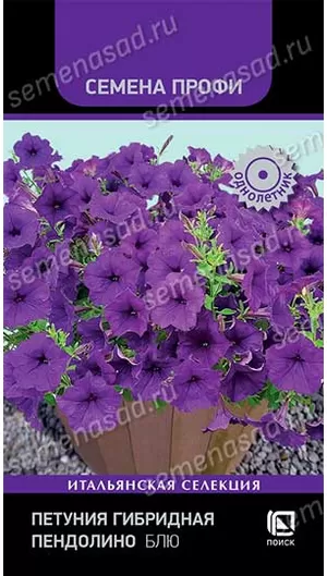 Растение напоминает калибрахоа: длинные ниспадающие побеги, достигающие в длину до 1 метра, направлены вверх и в стороны, благодаря этому середина куста никогда не бывает пустой. Относится к группе минимультифлора. Размер цветка 2-3 см. Окраска синяя. Непрерывно цветёт с ранней весны до поздней осени, благодаря гену мужской стерильности. Высокая устойчивость как к повышенным, так и пониженным температурам. Быстро восстанавливается после дождей. Подходит для крупных кашпо и ландшафтного дизайна.