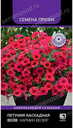 Ампельная петуния, которая может использоваться как почвопокровное растение за счет стелющегося габитуса. Длина побегов 90-120 см. Крупные цветки диаметром 5-6 см формируются по всей длине побега. Окраска - карминно-красная с бархатным отливом. Обильное и продолжительное цветение. Устойчива к непогоде. Подходит для ландшафтного дизайна и высадки в большие вазоны.