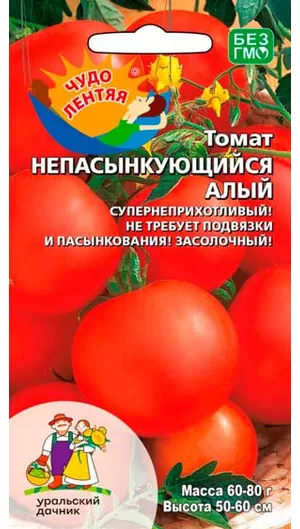 Супернеприхотливый раннеспелый сорт. Растение штамбовое, детерминантное, прямостоячее, слабоветвистое, высотой 50-60 см. Плоды плоскоокруглые, слаборебристые, алого цвета, массой 60-80 г.